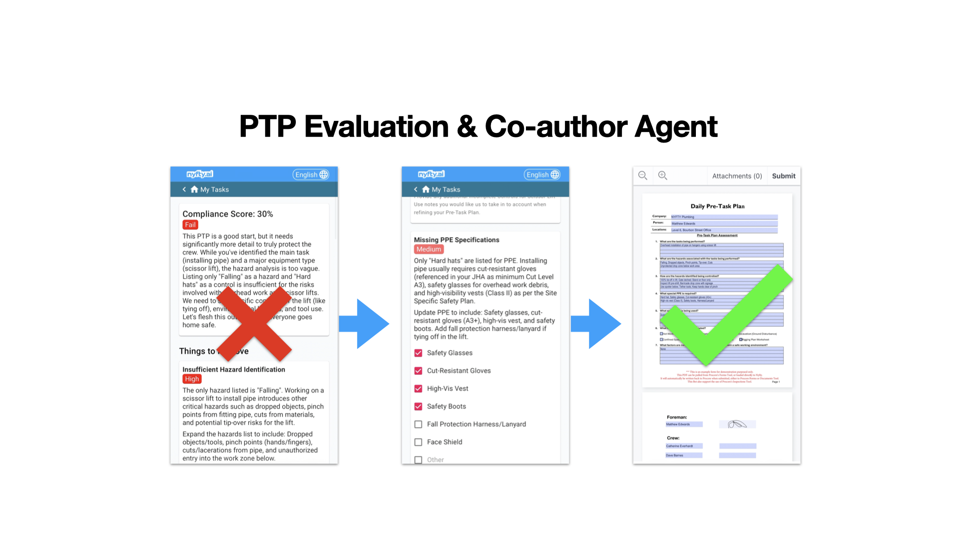 The Evaluation agent even works with photos of handwritten Pre-Task Plans, and if the PTP fails the standard, it still helps the foreman correct it. Obviously, it can’t actually write on the paper, but it can tell the Foreman what they need to add in order to meet standards. The Foreman simply updates their hand written PTP and submits it again.